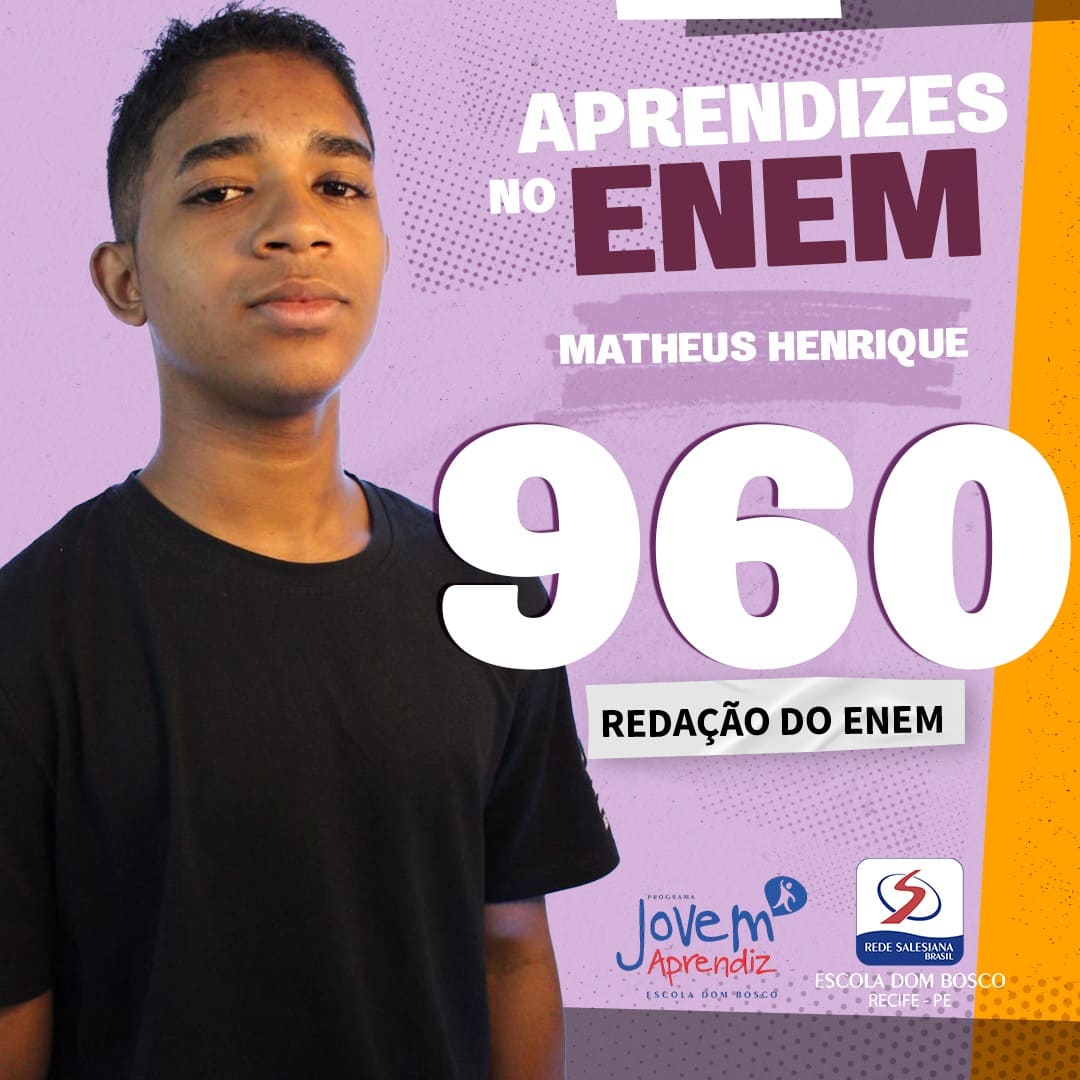 17 de janeiro de 2024 Por CruzNo último Exame Nacional do Ensino Médio (ENEM), Matheus Henrique, Jovem Aprendiz da Escola Dom Bosco Recife, conquistou uma nota extraordinária de 960 na prova de redação. Seu desempenho não apenas destaca a promoção de escolas públicas, mas também ressalta seu comprometimento e dedicação diários aos estudos.